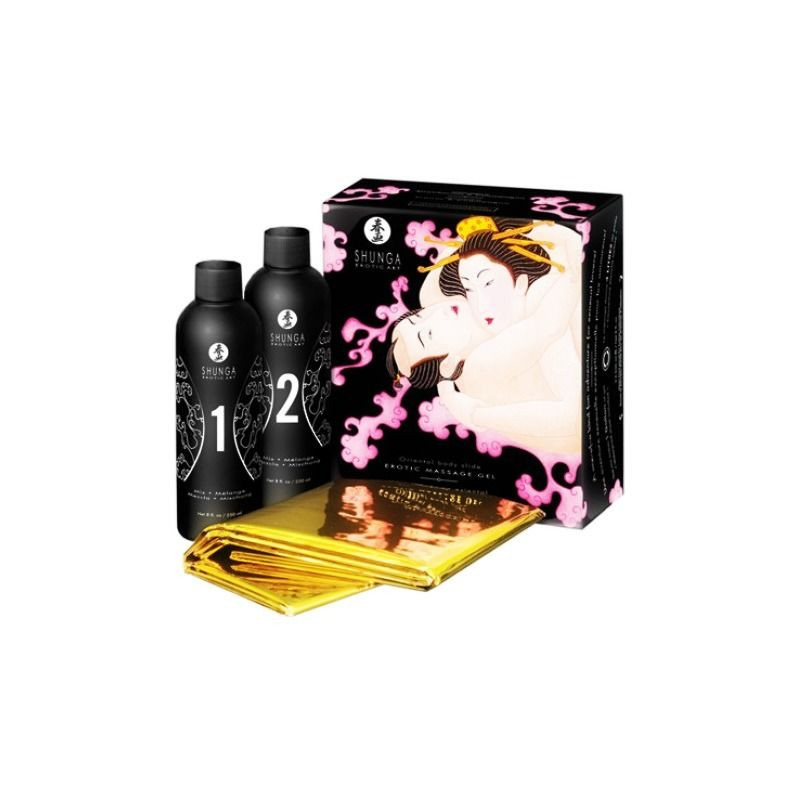 Este kit contiene una solución para preparar 4 litros de suave y tibio gel de masaje, y una gran sábana dorada que hará que os trasladeis al mundo del placer intenso