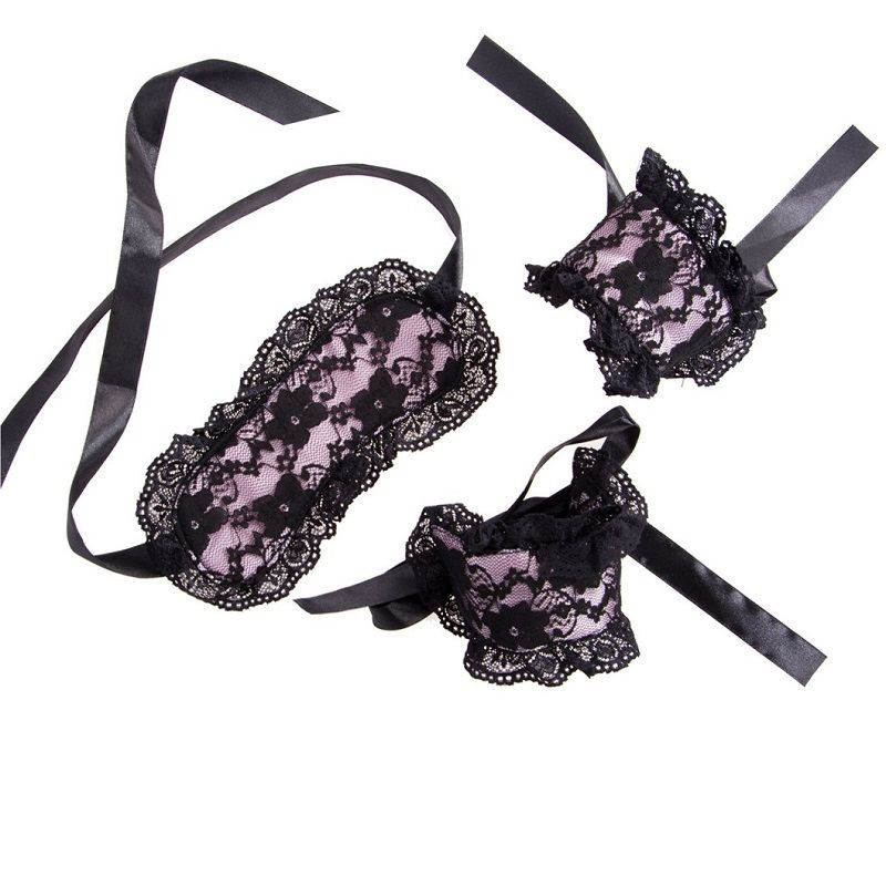 Conjunto de 2 piezas de bondage con estampado floral compuesto por una máscara y esposas. Acolchado y con finas cintas fácil de atar.