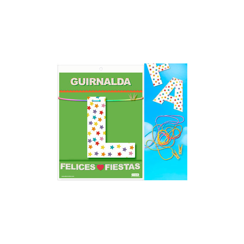 GUIRNALDA FELICES FIESTAS (Cartulina impresa a dos caras 220gr) Contenido: Letras, cordel arco iris 3 metros, 2 Mini pinzas de madera. /