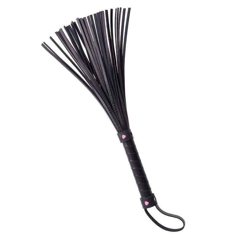 Látigo azotador de cuero con pequeños corazones de color rosa.