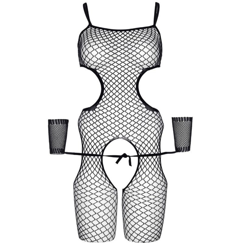 2 PC. Industrial net cut out suspender bodystocking and matching wrist restraint cuffs.