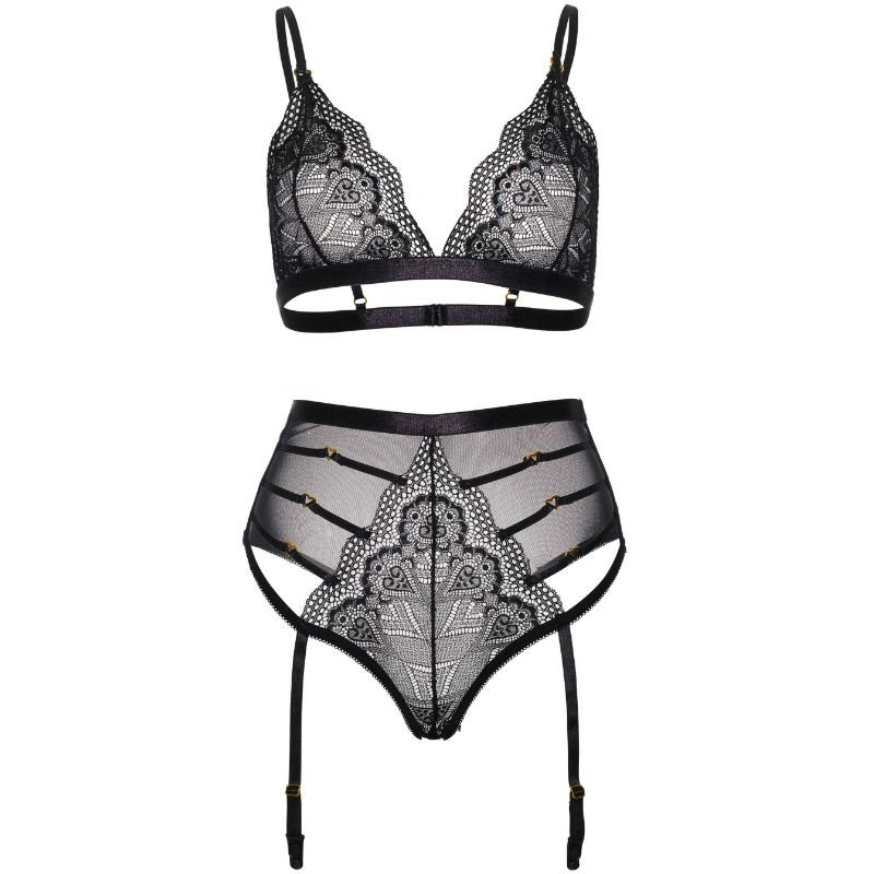 2 Pzs. Conjunto de lencería, incluye sujetador de encaje con borde festoneado y tanga a juego adornada con tiras con corazones dorados, con liguero con ligas ajustables y escudete de algodon fabricado por la prestigiosa marca de lencería Leg Avenue.