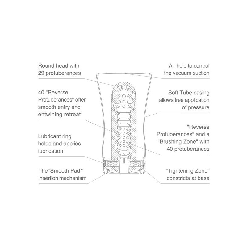 Encuentra tu punto simplemente apretando o soltando el flexible Soft Tube Cup. Aplicando presión sobre la cubierta exterior produce distintos niveles de sensación, más ajustado o más suave.