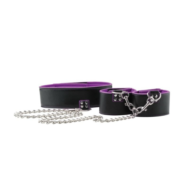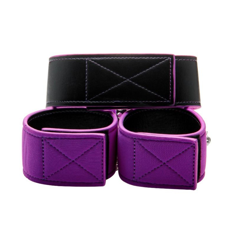 Este collar con esposas está diseñado con un lado de cuero y otro de neopreno para que puedas elegir el material que sentirás en la piel simplemente dando vuelta el collar. ¡El lado de neopreno es de color y el lado de cuero es negro para darle una apariencia más ruda! También tiene un cierre de velcro para que le quepa a todos, un cierre a presión para combinarlo con otros juguetes para “bondage”, y también puedes combinarlo con esposas de otros colores!
