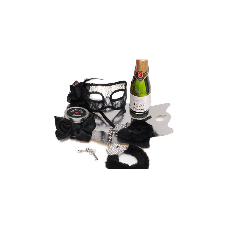 Contenido: Máscara Veneciana, Vela Fragancia Lazo, Esposas Brillante y Llaves, Cava