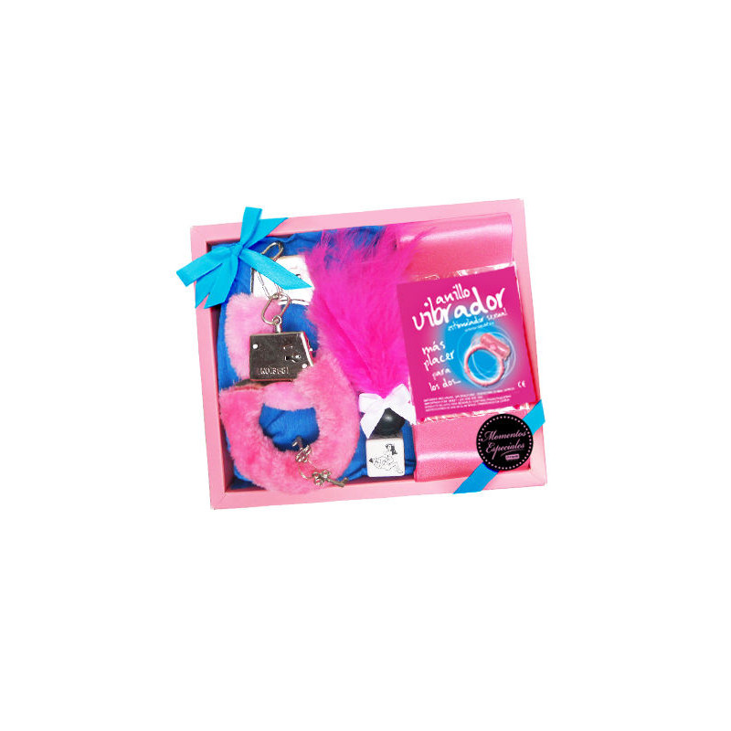 Contenido: Esposas, llaves, plumero, anillo vibrador, cinta antifaz, Dado erótico posturas.
