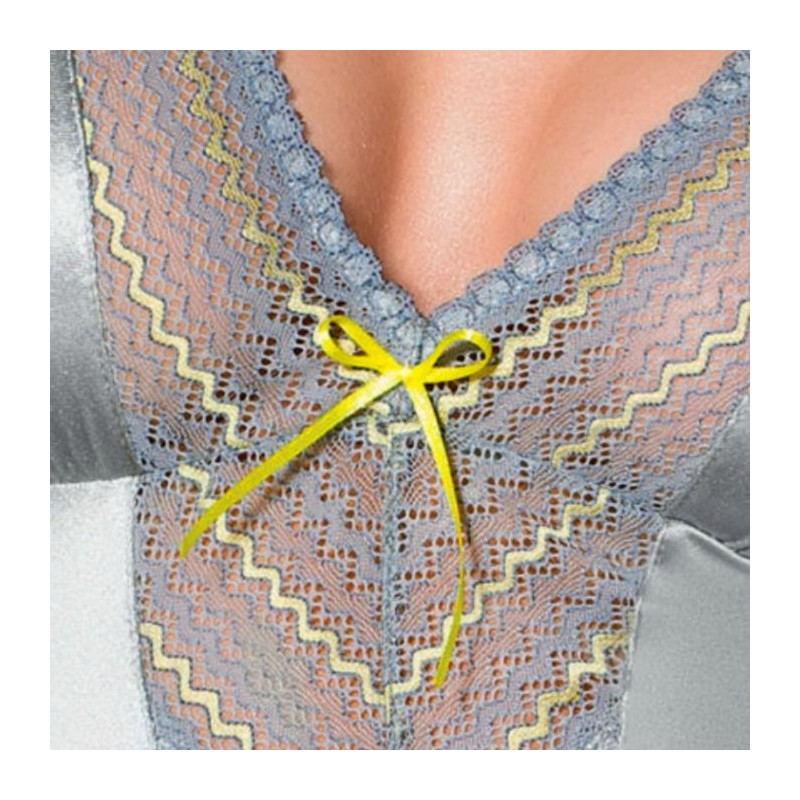El body de la colección Avena es un elegantísimo body de color plateado con semitransparencias a la altura del pecho y un coqueto lazo amarillo creado por Casmir, lo cual significa que es sinonimo de Alta Lenceria y que cada prenda ha sido confeccionada en Europa con un riguroso control que da como resultado a una prenda exclusiva.