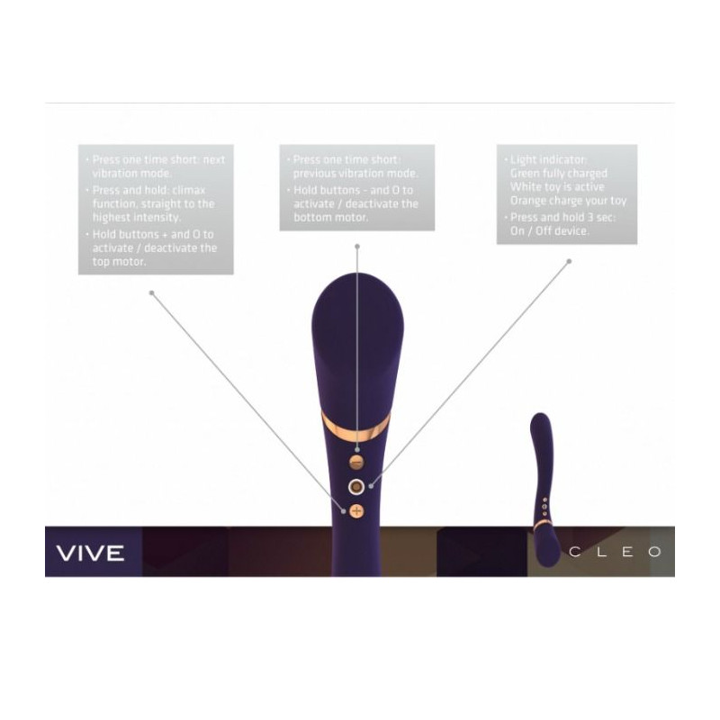 Vive es un nuevo fenómeno en el mundo de los productos de placer de lujo para adultos. El Cleo tiene un diseño exclusivo, que es un deleite para los ojos y su forma idiosincrática te transportará a ambientes extáticos. Los 10 diferentes patrones de vibración provienen de una nueva tecnología patentada, recargable y única, que hace que sea increíblemente fuerte.