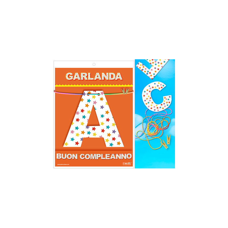 GUIRNALDA BUON COMPLEANNO(Cartulina impresa a dos caras 220gr) Contenido: Letras, cordel arco iris 3 metros, 2 Mini pinzas de madera. /