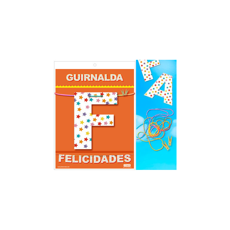 GUIRNALDA FELICIDADES (Cartulina impresa a dos caras 220gr) Contenido: Letras, cordel arco iris 3 metros, 2 Mini pinzas de madera.