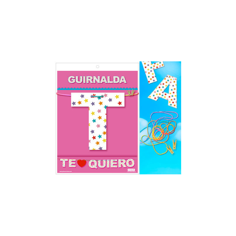 GUIRNALDA TE QUIERO (Cartulina 220gr) (Cartulina impresa a dos caras 220gr) Contenido: Letras y corazón, cordel arco iris 3 metros, 2 Mini pinzas de madera. /