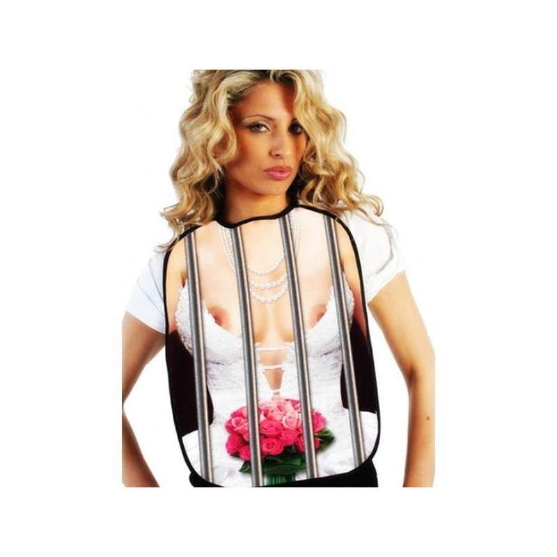 Fabuloso babero inspirado en un vestido nupcial con ramo de flores metida en una carcel..