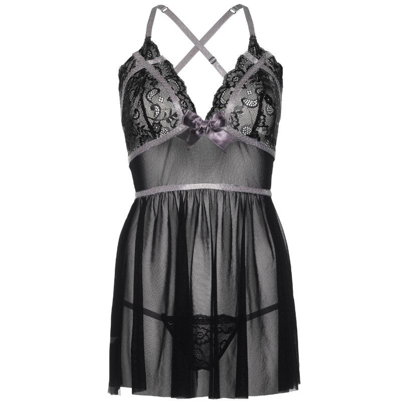 Set de dos piezas con badydoll de gasa transparente con encaje metálico, adornos de satén, correas cruzadas ajustables en la espalda y tanga a juego fabricado por la prestigiosa marca de lencería Leg Avenue.