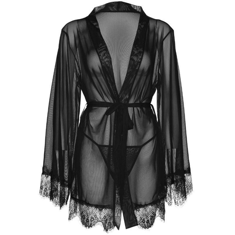 Set de tres piezas compuesto por un Picardías transparente con mangas acampanadas bordadas y de encaje, con cinturón y tanga a juego fabricado por la prestigiosa marca de lencería Leg Avenue.