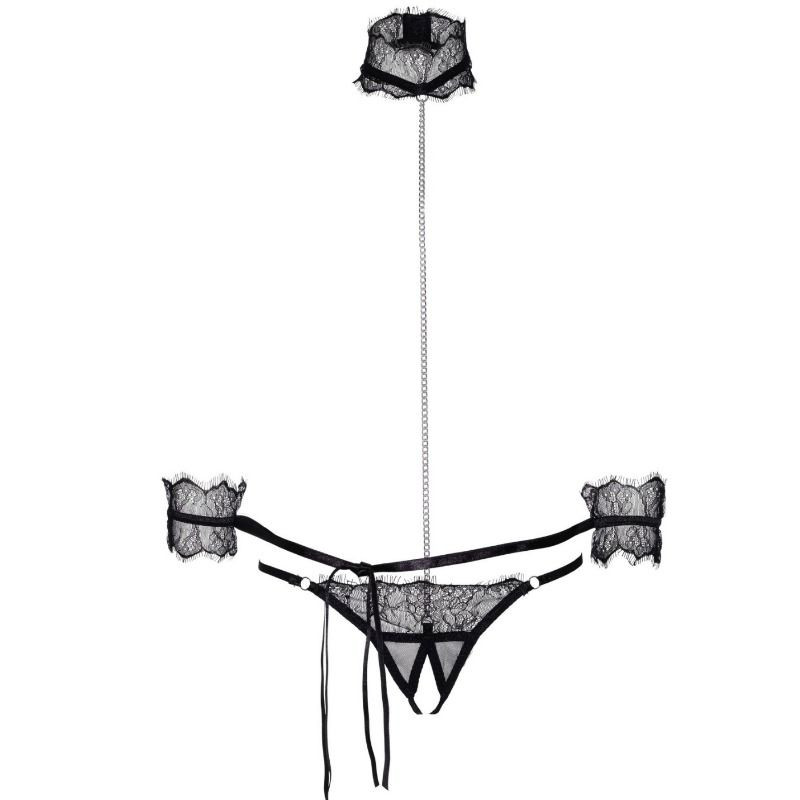 Set de dos piezas estilo bondage, compuesto por tanga con encajes y entrepierna abierta con cadena hasta el cuello y gargantilla de encaje y con puños de encaje a juego.