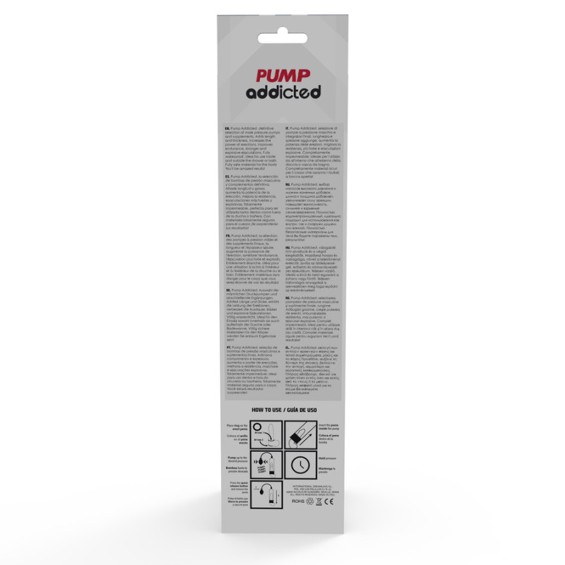 Pump Addicted ayuda a alcanzar la erección de una forma más sencilla utilizando un sistema de vacío que hace que la sangre se concentre en el pene cuando todavía está flácido. La erección se alcanza y mantiene mediante un sellado cómodo y hermético en la base del cuerpo, justo en la unión del pene con el pubis, gracias al cual se mantiene la sangre en el tronco. Gracias a la manga, el sellado es firme, cómodo y estrecho sin apretar.