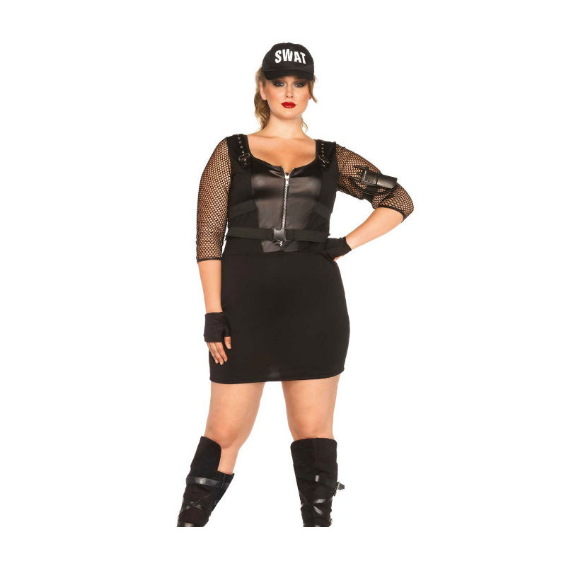 Disfraz De 5 Piezas, Incluye Vestido Con Cremallera Frontal Con Mangas De Red Y Cinturón Adjunto, Banda De Brazo, Walkie Talkie De Juguete , Guantes Sin Dedos, Y Gorra Swat. La medida del vestido de talla 1XL-2XL esta medida desde el hombro y es de 97 cm, la modelo mide 185 cm Y lleva una talla 1XL-2XL.