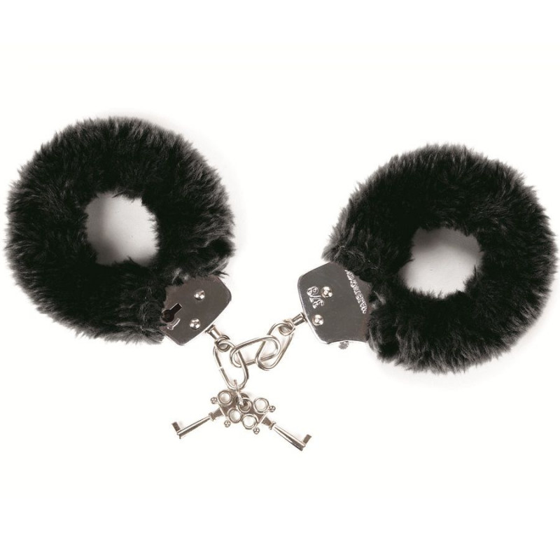 Esposas de muñeca de dos piezas unidas con una cadena de acero cromado, recubiertas con un suave peluche alrededor de los puños de color negro.