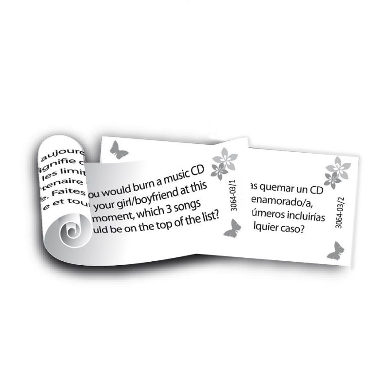 En los rollitos de papel del Corazón lleno de Cosquilleos Amorosos se encuentran preguntas y pruebas como: