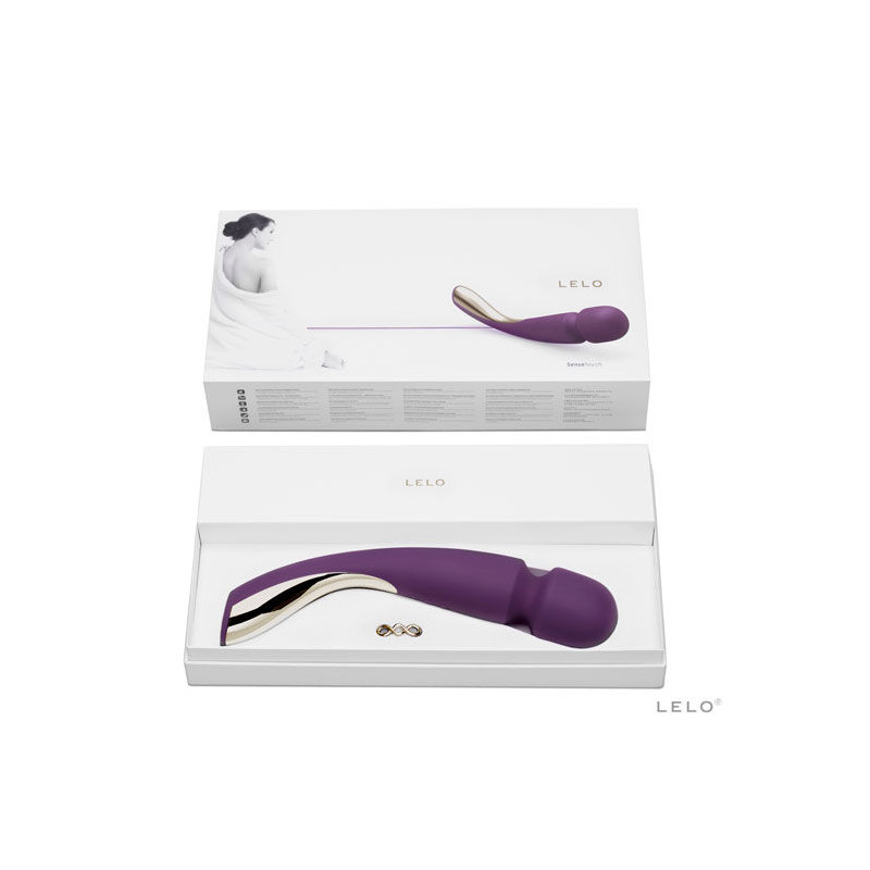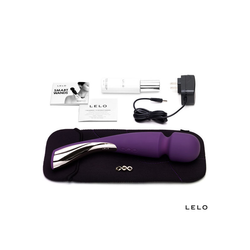 Smart Wand se presenta en la galardonada caja LELO con su cargador específico del país, una bolsita de satén para guardarlo, un broche INSIGNIA y la garantía completa de 1 año.