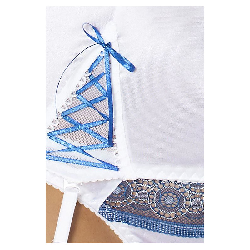 Comparte la experiencia Passion, sientete sexy con este increible Corset con liguero 100% confeccionado en Europa en color blanco y azul electrico con detalles bordados fusionando dos telas completamente ajustado al cuerpo realzando la silueta de la mujer y potenciando tu sensualidad , este corset incluye cintas que se adaptan a tus medias favoritas ( no incluidas ) y un tanga a juego confeccionado en la misma tela. Con los Corset´s de Passion sentirás comfort, potenciarás toda tu sensualidad, serás unica! Esta pieza ha sido diseñado y fabricado por la prestigiosa marca PASSION LINGERIE.