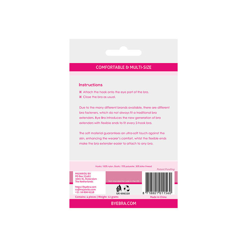 Bye Bra propone la nueva generación de extensores de contorno que se adaptan a sostenes de 2 o 3 ganchos. Los extensores se usan para alargar los sujetadores demasiado apretados al nivel de la cintura, mejorando la comodidad del sostén.