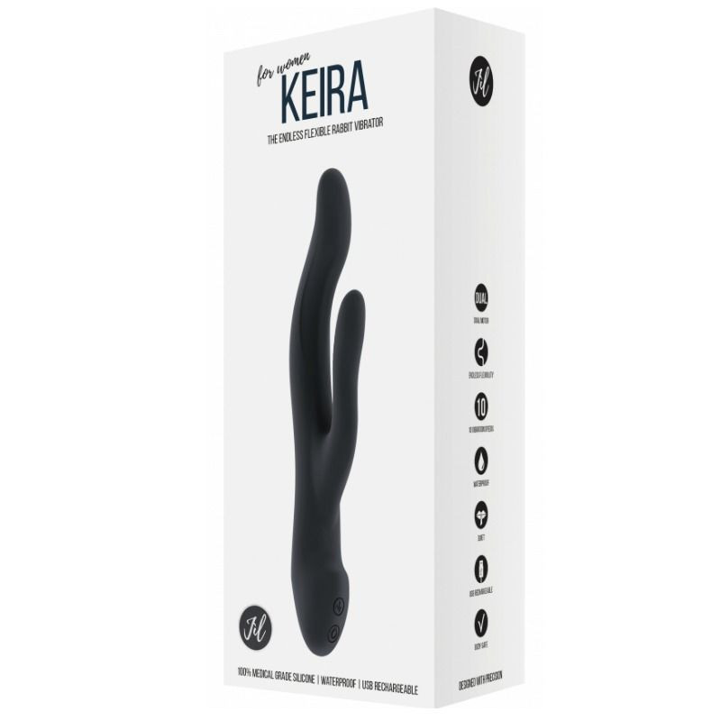 Jìl te hará sentirte más sensual que nunca. Keira es un vibrador para parejas con forma de conejo muy eficaz que ha sido diseñado con la máxima precisión para satisfacer todos tus deseos. Hemos utilizado una nueva tecnología para desarrollar este juguete sexual con silicona de grado médico, confiriendo a Keira suavidad y una flexibilidad ilimitada para adaptarse a la perfección a tu cuerpo. ¡Los dos supersilenciosos motores de 10 velocidades proporcionan una placentera estimulación del clítoris y de la vagina incluso en las zonas más profundas! ¡Además, es posible accionar los botones con una sola mano!